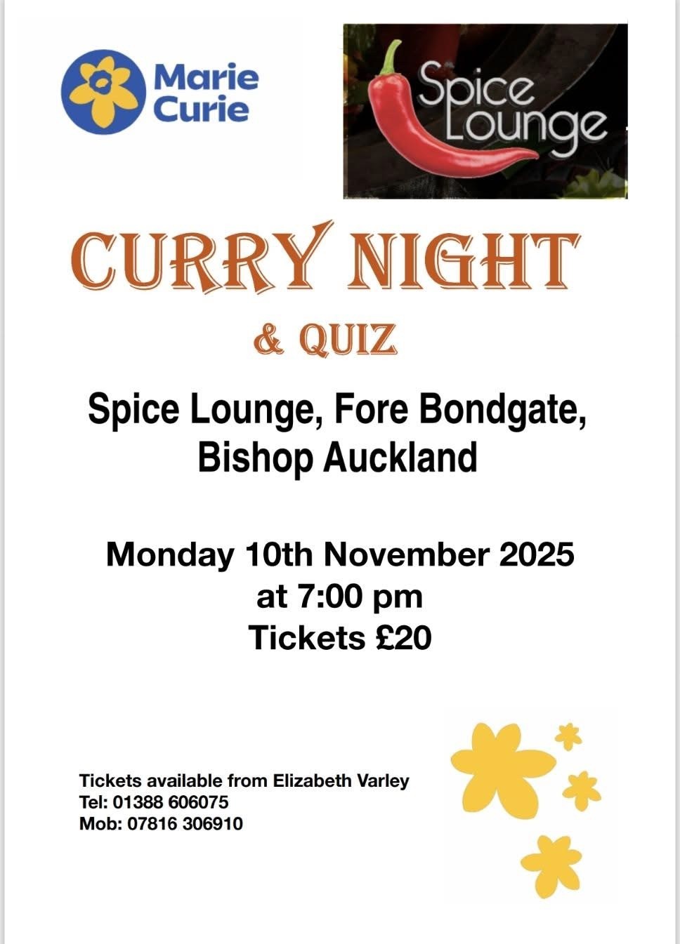 Raising money for Marie Curie in Bishop Auckland. To purchase tickets call Elizabeth Varley on 07816 306910